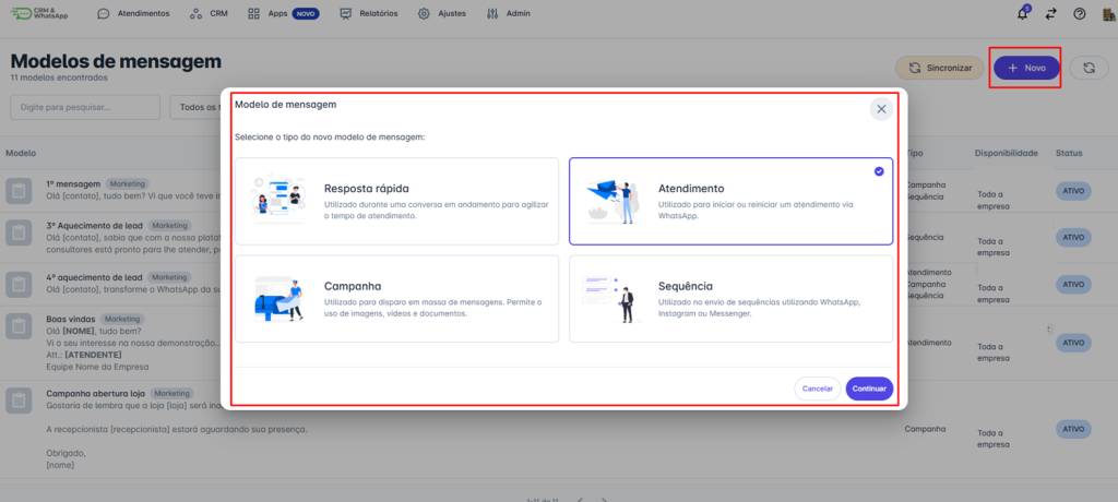 • Somente os usuários com perfil de Administrador podem cadastrar modelos de mensagens do tipo Campanha, Atendimento, Sequência e Resposta Rápida.