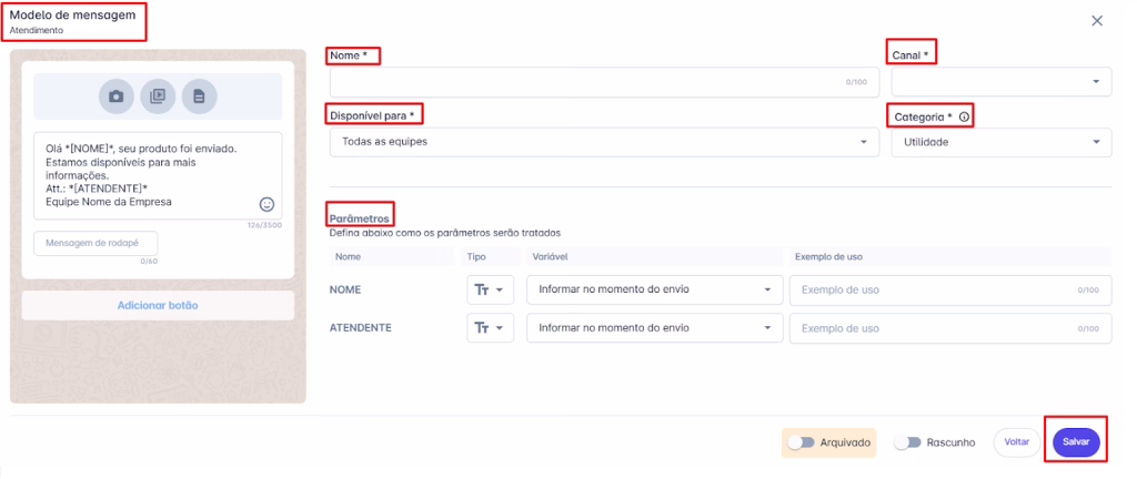 • Descrição: É possível definir para quais equipes este modelo de mensagem ficará disponível.