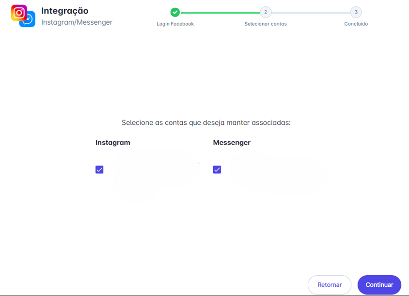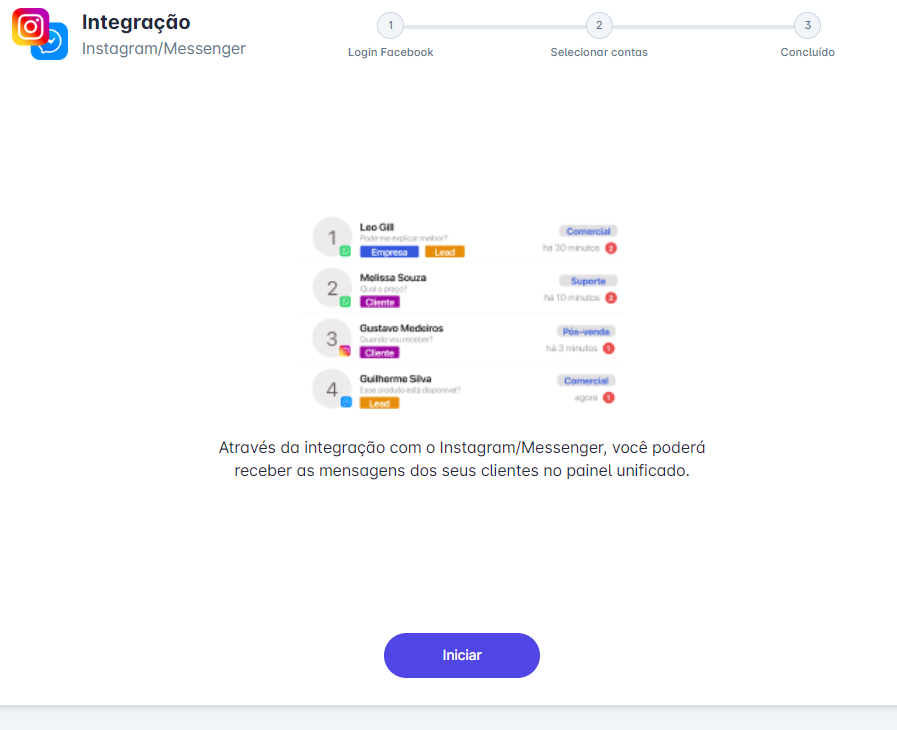 - Somente os usuários com perfil de Administrador podem fazer a conexão do Instagram e/ou Messenger