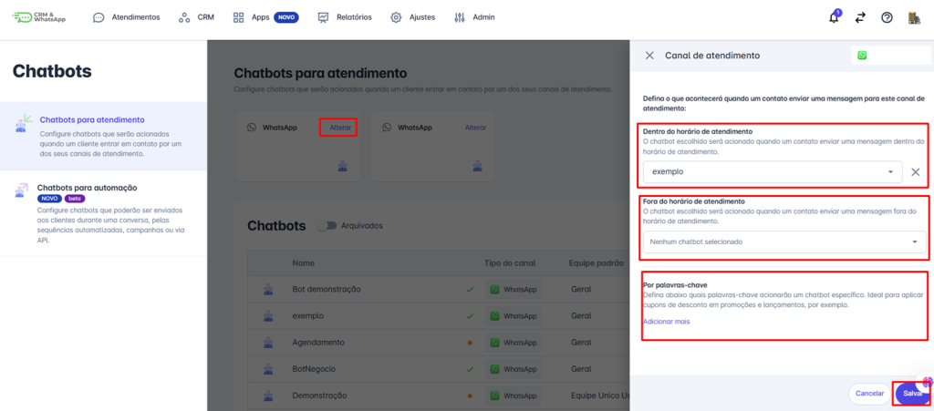 Clicando no link “Alterar”, localizado no quadrinho do canal de atendimento, você pode definir qual chatbot será acionado durante o horário de trabalho e qual será utilizado fora do horário de trabalho.